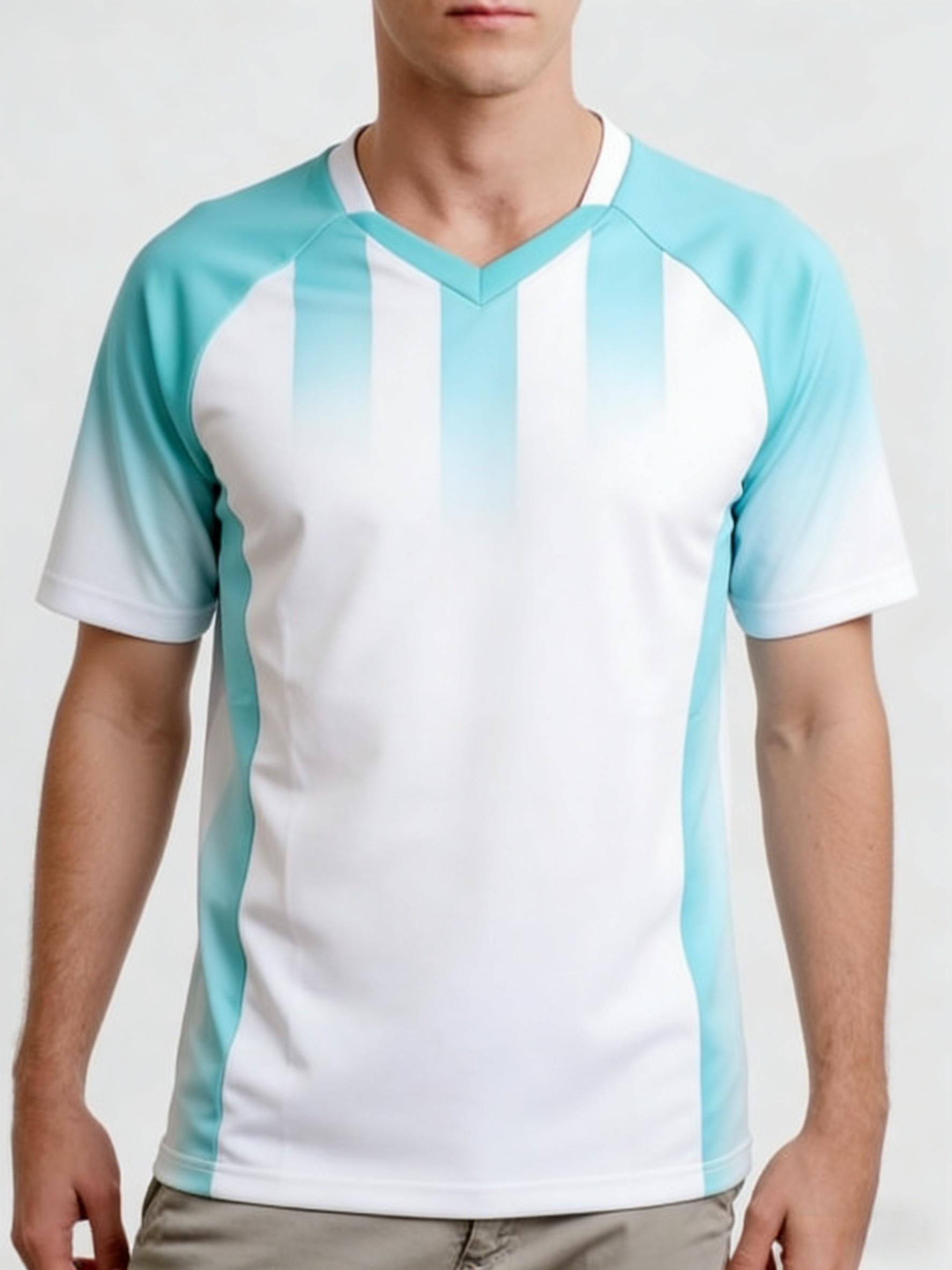 This vibrant soccer jersey features a sleek turquoise-to-white gradient design with vertical color blocking. The V-neck collar and short sleeves ensure a comfortable, unrestricted fit. Ideal for soccer matches, practice, or everyday casual outfits. Breathable fabric keeps you fresh all day.